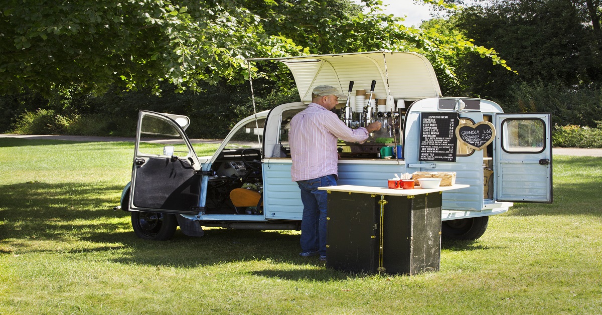 Kedai kopi juga dapat dibuat bergerak menggunakan fasilitas penyajian kendaraan. Dengan kata lain ini disebut truk kopi atau mobil kopi, tergantung pemikiran kendaraannya, yang menjajakan kopi dengan berjalan-jalan atau “nongkrong” di pinggir jalan yang diizinkan dan dipilih yang ramai.