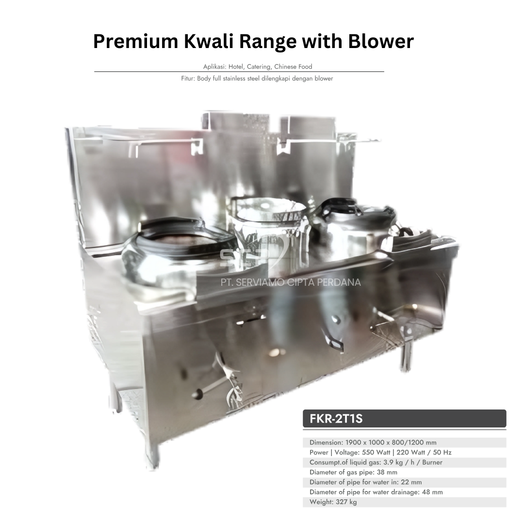 Kwali Range with Blower adalah kompor dengan komponen yang terbuka sehingga nyala api dapat terlihat secara jelas dan langsung terekspos ke udara. Karena tidak memiliki penutup, sehingga nyala api akan langsung mengenai panci atau penggorengan diatasnya sehingga membuat pembakaran lebih sempurna. KR-2T1S memiliki 2 tungku pembakaran dan 1 ring soup, dengan dimensi kompor 1900 x 1000 x 800/1200 dan berat 327 Kg.