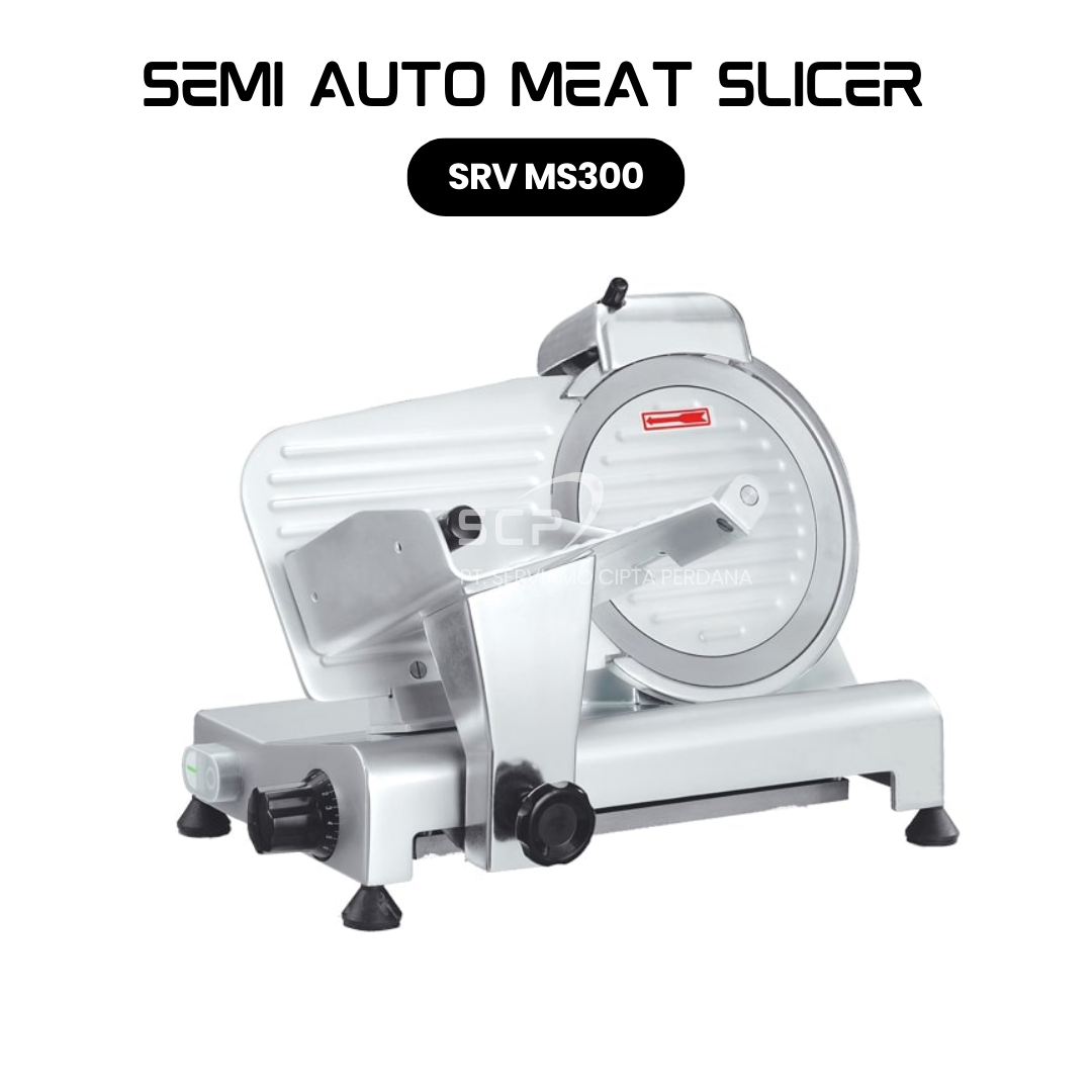 Meat Slicer berfungsi untuk mengiris daging beku menjadi helaian daging tipis dan halus, ketebalan daging dapat disesuaikan sesuai kebutuhan (biasanya 2 – 10 mm). Daging yang digunakan sebaiknya daging beku dengan suhu sekitar -5 hingga 15 derajat, agar mendapatkan hasil irisan yang optimal dan simetris. MS300 memiliki ukuran 530 x 460 x 460, kekuatan 420 W dan diameter pisau 300 mm